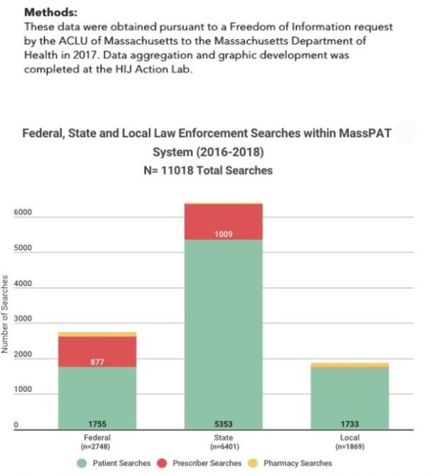 New from @ACLU_Mass & our lab: We FOIA’d @MassDPH for instances of law enforcement searching patients’ Prescription Drug Monitoring data. We found Federal, State, and Local law enforcement conducted thousands of searches of sensitive patient medical records. /1
